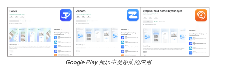 卡巴斯基专家还发现,Google Play应用商店中有多款应用感染了Keenadu恶意软件。这些应用属于智能家居摄像头类软件,累计下载量已超过30万次。截至本文发布时,这些应用已从Google Play移除。当这些应用程序启动时,攻击者可以在应用程序内启动不可见的网页浏览器标签页,这些标签页可以在用户不知情的情况下浏览不同的网站。其他网络安全研究人员之前的研究也表明,类似的受感染应用程序通过独立的 APK 文件或其他应用商店分发。