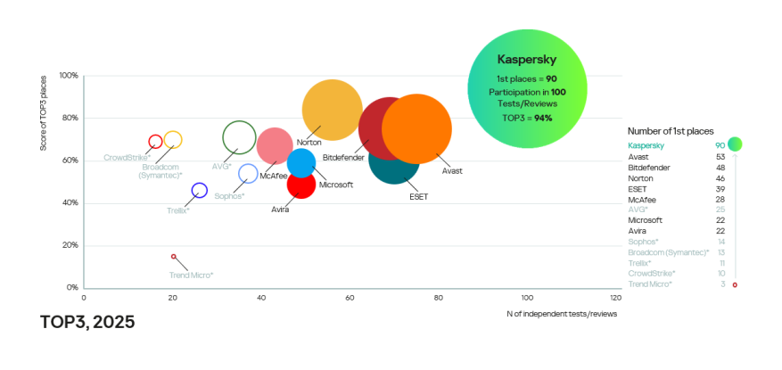 卡巴斯基的企业和消费级解决方案定期接受由独立测试机构进行的一系列详尽的、多维度的评估程序。2025年标志着TOP3指标排名历史上的又一个成功篇章。在2013-2025年期间,卡巴斯基参与了1100多次独立评估,其中965次跻身前三名,并在所有竞争对手中获得最高分。