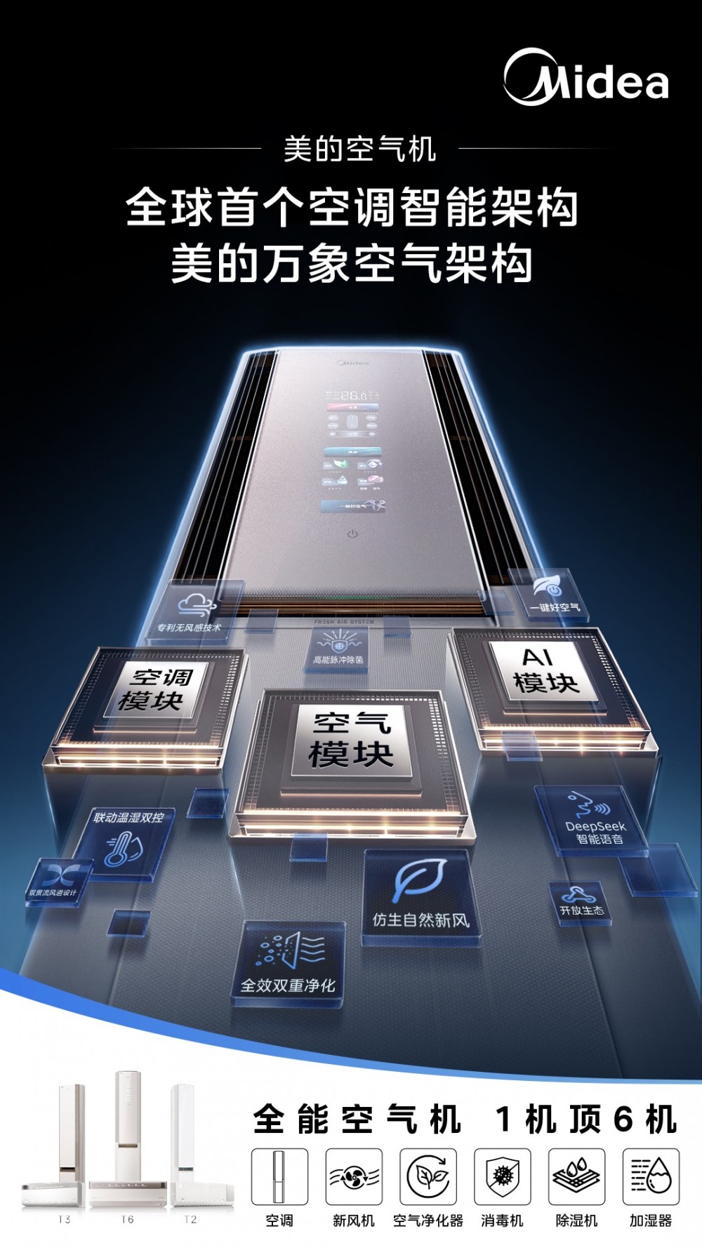 基于这套架构,美的空气机T6实现了一台机器承载空调、新风机、净化器、除菌机、除湿机、加湿器六大功能——1机顶6机,2050m³/h超大循环风量、246m³/h超大新风量、430m³/h CADR净化值,每一项指标都直接对标专业设备。搭载DeepSeek大模型后,用户只需一句“我有点闷”,AI就能自动协调新风、净化、除菌各模块完成全托管响应。