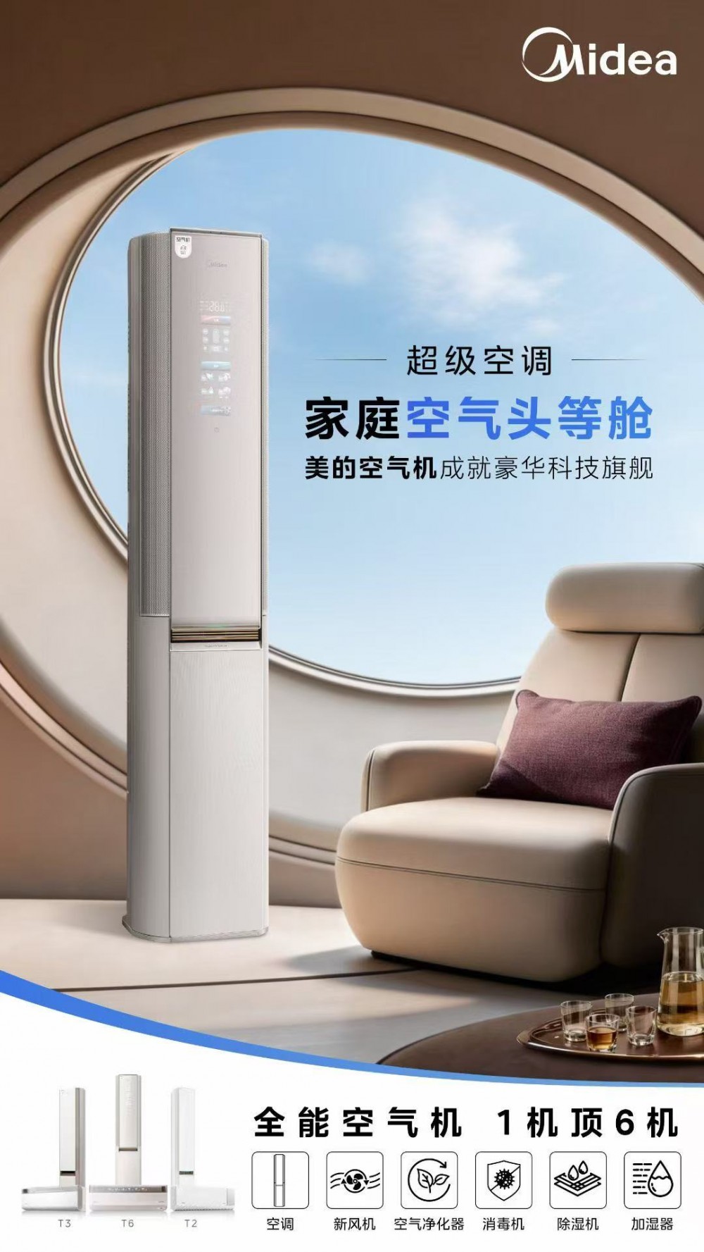 而将这一理念真正落地的,正是美的空气机。它以“超级空调”之名,定位空调领域的豪华科技旗舰,重新定义高端空气管理的豪华标准:一台美的空气机集成空调、新风机、净化器、除菌机、除湿机、加湿器六大功能,一机顶六机,用户无需在客厅堆砌多台设备,即可包揽全屋空气管理;从卧室睡眠到客厅欢聚,从梅雨除湿到雾霾净化,从夏季制冷到冬季供暖,一台机器从容应对四季更迭、全天候的复杂空气需求;更值得一提的是,它预埋技术接口、开放生态连接,支持按需组合与持续进化——今天购买的是一台空调,未来收获的是一个会生长的空气生态系统。当新的空气技术出现、新的健康需求产生,美的空气机可以通过OTA升级与模块扩展持续进化,永不落伍。