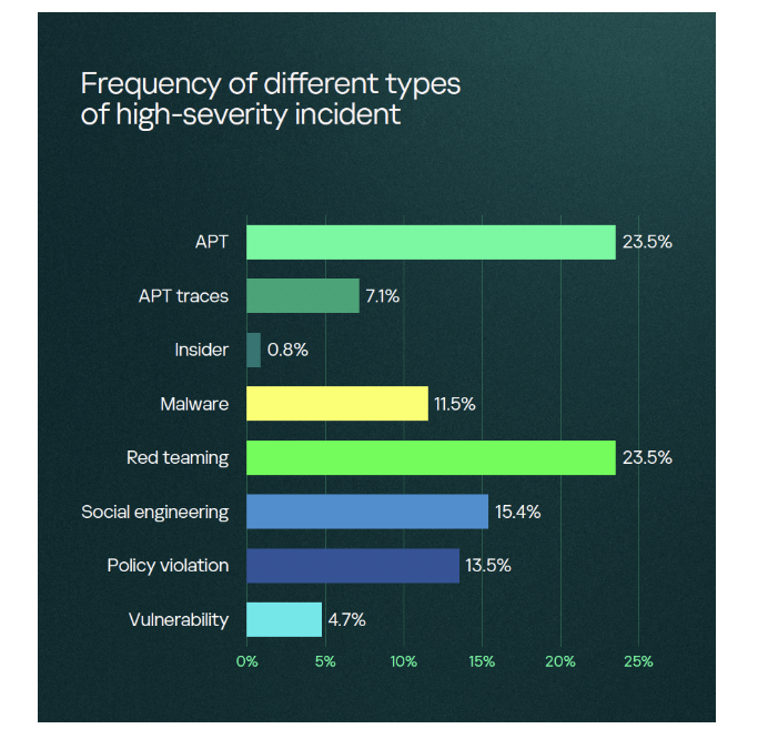恶意软件事件占比不足12%,而过去人为驱动攻击留下的痕迹(即APT攻击痕迹)则出现在超过7%的案例中。漏洞检测虽然并非卡巴斯基MDR的核心关注点,但在不到5%的事件中有所报告。