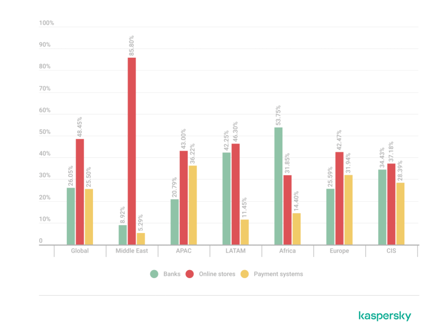 攻击者正根据各地区的数字习惯调整攻击策略。在中东,金融钓鱼几乎完全集中在电子商务领域(85.8%),表明其高度依赖在线零售诱饵;而在非洲,与银行相关的钓鱼占据主导地位(53.75%),这可能表明该地区用户账户的安全性仍然不足。拉丁美洲的分布较为均衡,但针对电子商务(46.3%)和银行(42.25%)的钓鱼攻击占比更高;而亚太地区和欧洲在三大类别中的分布则更为均衡,这表明攻击策略呈现多样化。